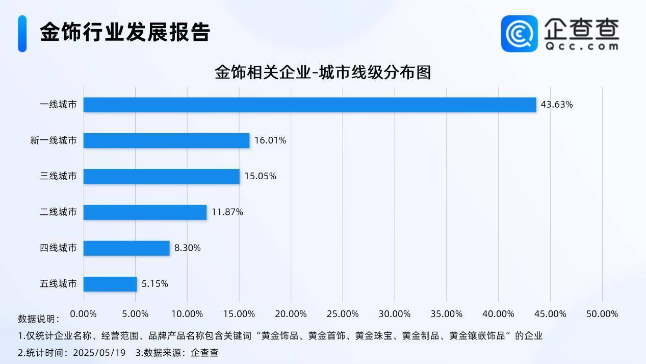 企查查数据显示,从城市线级分布来看,金饰相关企业多分布在高能级城市,一线城市相关企业存量最多,占比43.63%。其次,新一线城市、三线城市相关企业存量分别占比16.01%、15.05%。